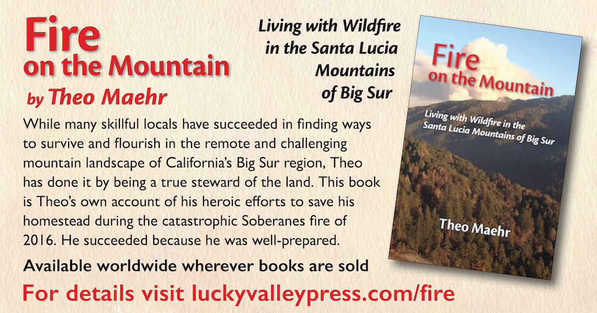 While many skillful locals have succeeded in finding ways to survive and flourish in the remote and challenging mountain landscape of California's Big Sur region, Theo has done it by being a true steward of the land. This book is Theo's own account of his heroic efforts to save his homestead during the catastrophic Soberanes fire of 2016. He succeeded because he was well-prepared.
